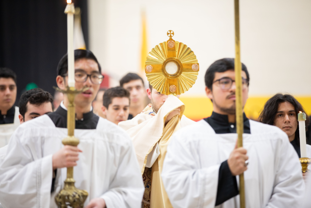 It should be obvious to all concerned that the habit of worship we’ve described, in all its beauty and profundity, is incredibly difficult. Not just for the obvious reasons we have spoken of, that training is required and that we are easily distracted and easily turned back in on ourselves. More tragically, though, these lips that speak God’s praises also soon take up gossip and slander. The hearts that we lift up to the Trinity in adoration are often deceitful. And it is for these reasons that the culmination of our worship is nothing we offer. The climax of our school worship cannot simply be preaching, no matter how engaging, or singing, no matter how robust, or prayer, no matter how earnest. These are our acts of devotion, but the crown of Christian worship, the end of Christian worship is not our offering, but His: the Eucharist. Our worship finds its source and summit in the Mass because there, and only there, is found the perfect act of worship and obedience to the Father.